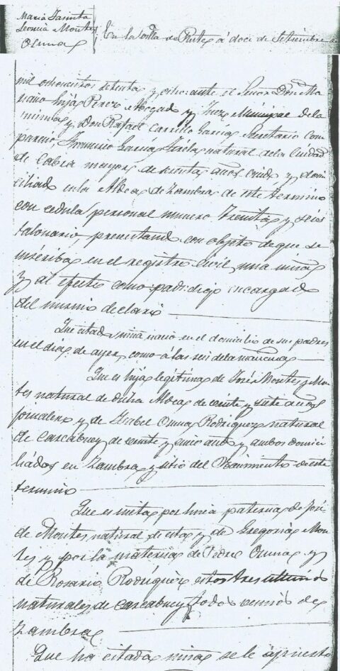 Que es nieta por línea paterna de José de Montes natural de esta y de Gregoria Montes y la materna de Pedro Osuna y de Rosario Rodríguez estos tres últimos naturales de Carcabuey todos vecinos de Zambra. Que la citada niña se le ha puesto por nombre María Jacinta Leoncia.