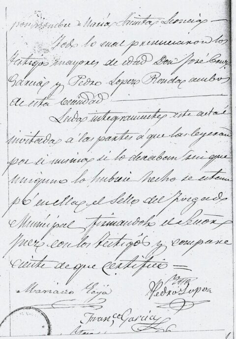 Todo lo cual presenciaron los testigos mayores de edad Don José “Cruz” García y Pedro López Ronda ambos de esta vecindad.